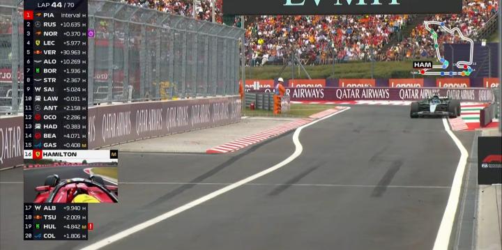 第44圈:汉密尔顿完成一停,拉塞尔确认执行二停,而勒克莱尔的身前仅剩两台未二停的迈凯伦;