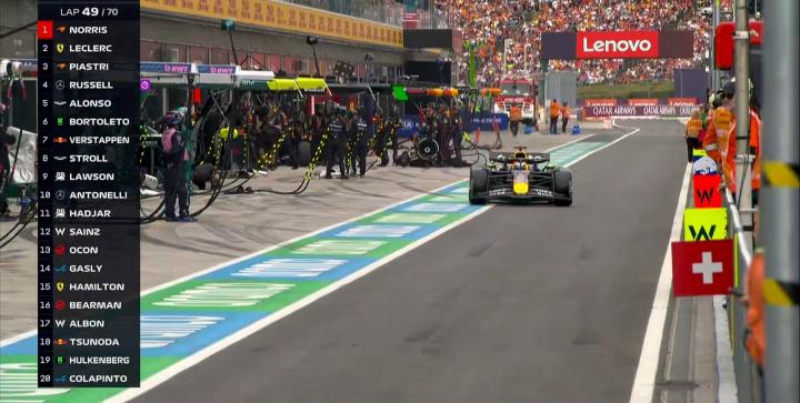 第49圈:维斯塔潘完成二停,出站后卡在第10名的安东内利身前;