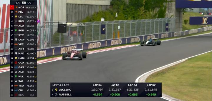 第58圈:勒克莱尔的圈速每圈都落后拉塞尔很多,后者也已经来到勒克莱尔身后;