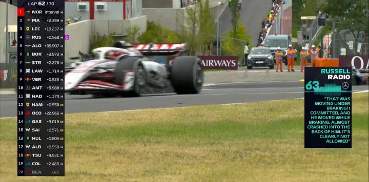 第62圈:拉塞尔向车队报告勒克莱尔存在刹车区变线的状况,这样的动作显然是违规的;