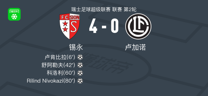 锡永4-0大胜卢加诺,Rilind Nivokazi破门,科洛利建功