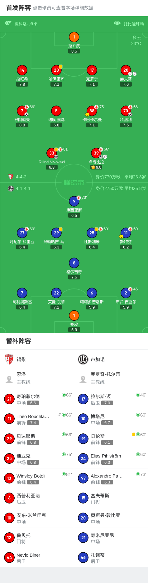 北京时间8月3日,瑞士足球超级联赛第2轮,锡永坐镇主场迎战卢加诺。比赛开始后,锡永迅速进入状态,第6分钟由赫夫蒂送出助攻,卢肯比拉攻入首球。上半场临近结束前,赫夫蒂再次送出精妙传球,舒阿勒夫冷静破门,帮助球队扩大领先优势。易边再战,锡永继续掌控节奏,第60分钟,卢肯比拉送出助攻,科洛利推射建功。比赛尾声阶段,Théo Bouchlarhem送出助攻,替补登场的Rilind Nivokazi破门得分。最终,锡永以4-0的比分完胜卢加诺。