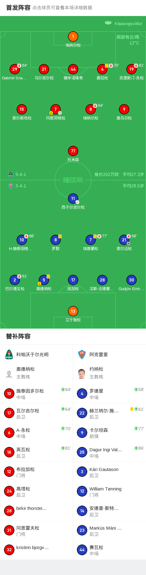 科帕沃于尔光明1-1阿克雷里,索尔达松打破僵局,冈恩劳格松扳平
