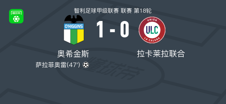 北京时间8月4日,智利足球甲级联赛第18轮,奥希金斯坐镇主场迎战拉卡莱拉联合。比赛中,奥希金斯球员萨拉菲奥雷成功打入全场唯一进球。最终,奥希金斯以1-0战胜拉卡莱拉联合,全取三分。