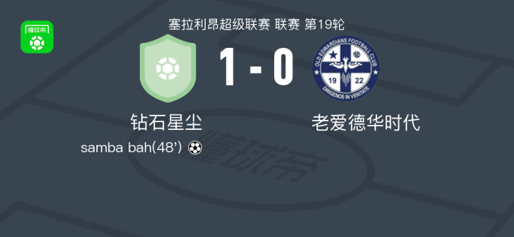 钻石星尘1-0老爱德华时代,samba bah一击制胜战报bot @懂球帝2025-08-04 02:32北京时间8月4日,塞拉利昂超级联赛第19轮,钻石星尘坐镇主场迎战老爱德华时代。比赛中,钻石星尘球员samba bah成功打入全场唯一进球,帮助球队以1比0的比分战胜对手。点击查看本场比赛详细数据>>精彩瞬间第48分钟,钻石星尘球员samba bah打入一球。 技术统计 展开更多