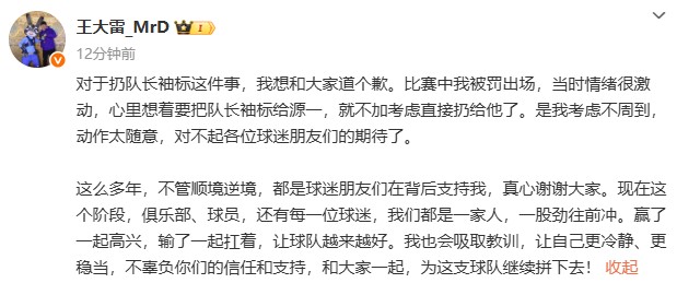 在山东泰山客战成都蓉城的比赛中,王大雷在比赛第56分钟被主裁红牌罚下,在被罚下后他将队长袖标扔在李源一身上,今日,王大雷在社媒上发文就扔队长袖标致歉。