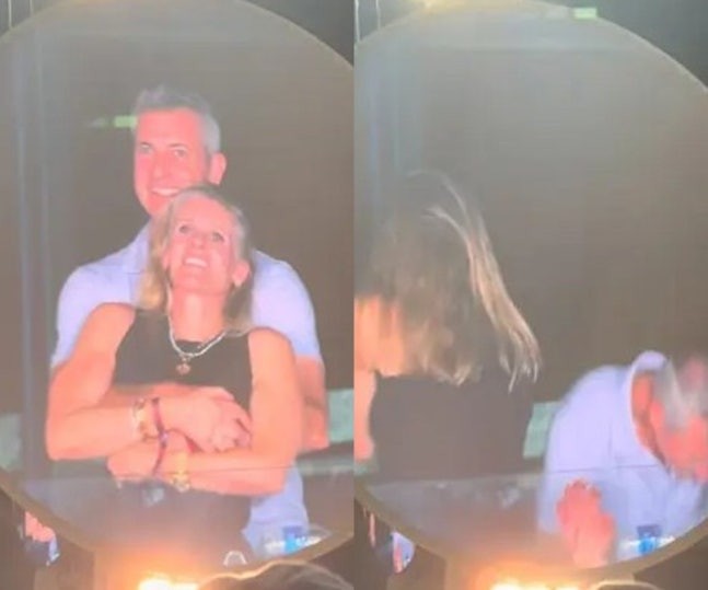 在酷玩乐队(Coldplay)在美国波士顿演唱会的 “Kiss Cam” 环节,摄影师将镜头对准了安迪-拜伦与克里斯汀-卡伯特,大屏幕上显示出两人紧紧抱着的画面。发现被拍到后,女方迅速捂脸转身,男方则赶紧低头蹲下。