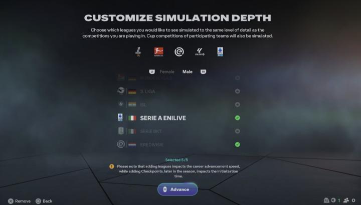 在《FC 26》的职业生涯模式中,全新的“深入模拟”功能上线。当你开启新的经理生涯时,除了你所在的主要联赛外,还可以额外选择最多5个其他联赛 进行同步模拟。这一设置在创建生涯时的菜单中完成。