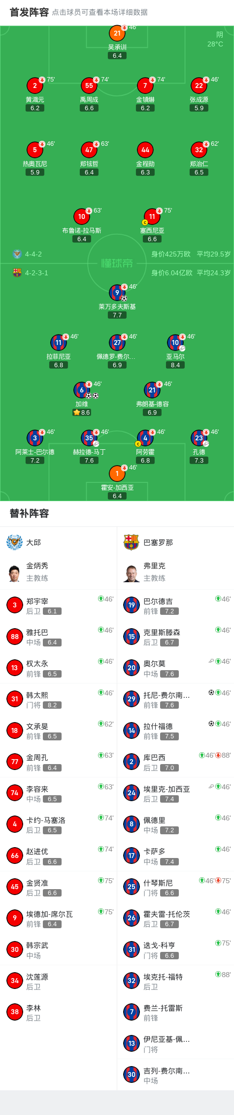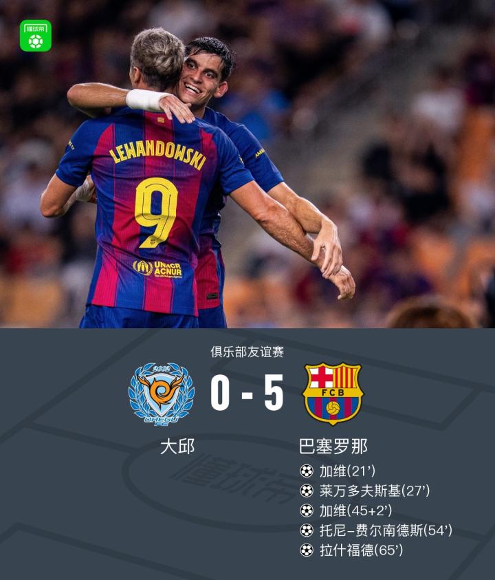 第29分钟,赫拉德-马丁助攻,莱万门前推射破门,巴萨2-0大邱