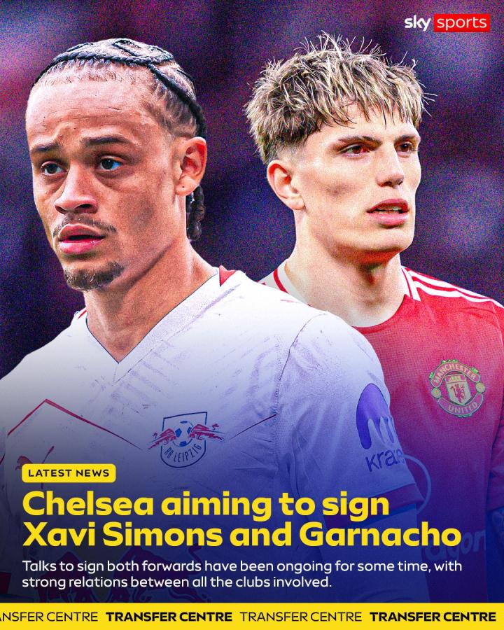 据报道,切尔西正在全力推进转会进程,俱乐部希望在转会窗口关闭前同时签下RB莱比锡中场球星哈维-西蒙斯和曼联前锋亚历杭德罗-加纳乔。