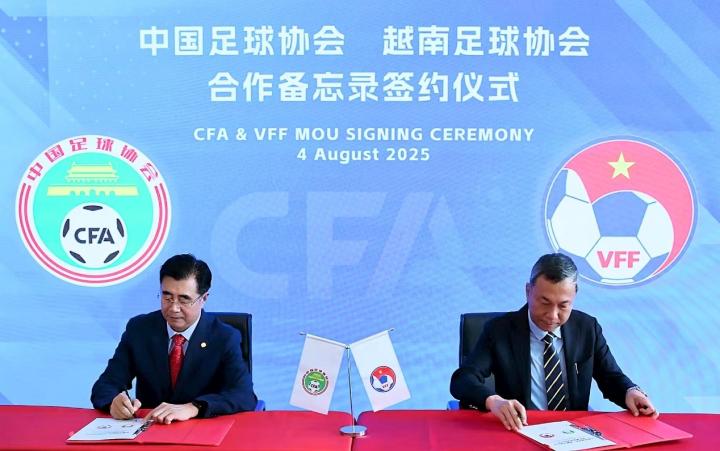 据中国足协官方消息,8月4日上午,中国足球协会主席宋凯在京会见了到访的越南足球协会主席陈国俊博士一行,并与其共同签署了《中国足球协会与越南足球协会合作备忘录》。此次签署标志着两国足球合作迈入新阶段,也为中越体育交流注入新动能。