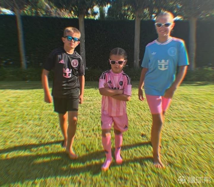 梅西粉丝?瓦尔迪的三个孩子穿着迈阿密国际的球衣拍照