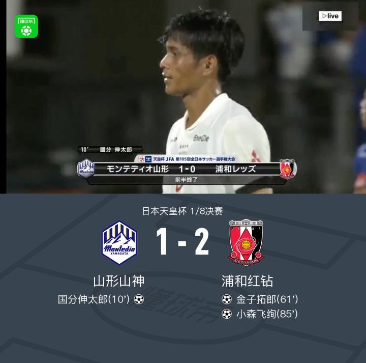 90分钟战报:山形山神1-2浦和红钻,金子拓郎扳平,小森飞珣反超比分