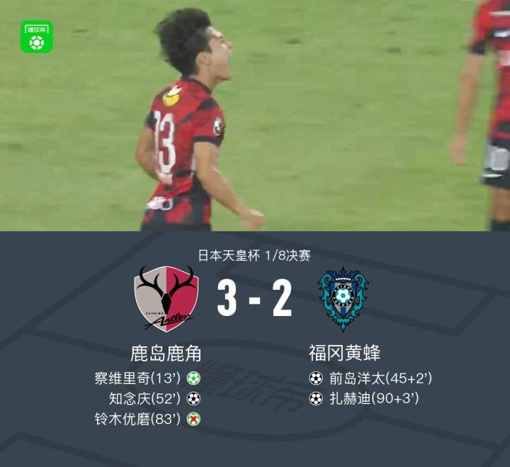 北京时间8月6日日本天皇杯 1/8决赛,鹿岛鹿角对阵福冈黄蜂。鹿岛鹿角察维里奇破门,知念庆破门。福冈黄蜂前岛洋太破门,扎赫迪破门。最终比分鹿岛鹿角 3-2 福冈黄蜂。