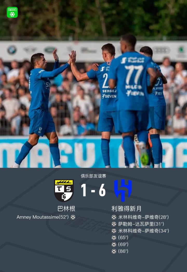 北京时间8月7日俱乐部友谊赛,巴林根对阵利雅得新月。巴林根Amney Moutassime破门。利雅得新月米林科维奇-萨维奇梅开二度,萨勒姆-达瓦萨里破门。最终比分巴林根 1-6 利雅得新月。