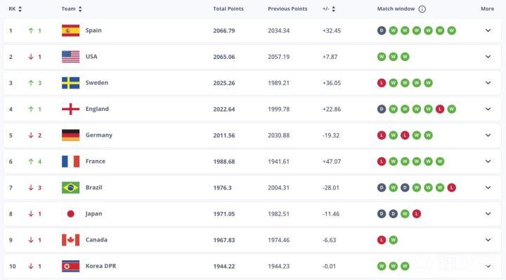 西班牙女足凭借女足欧洲杯中的亚军表现,上升至世界第1,美国女足则降至世界第2。世界第3到第10分别为瑞典女足、英格兰女足、德国女足、法国女足、巴西女足、日本女足、加拿大女足和朝鲜女足。