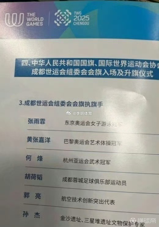 据网传组委会赛事安排手册显示,东京奥运会女子游泳冠军张雨霏、巴黎奥运会艺术体操冠军黄张嘉洋、杭州亚运会武术冠军何烽、成都蓉城足球俱乐部运动员胡荷韬、航空技术创新突出代表郭亮、金沙遗址、三星堆遗址文物保护专家孙杰将担任开幕式的执旗手。