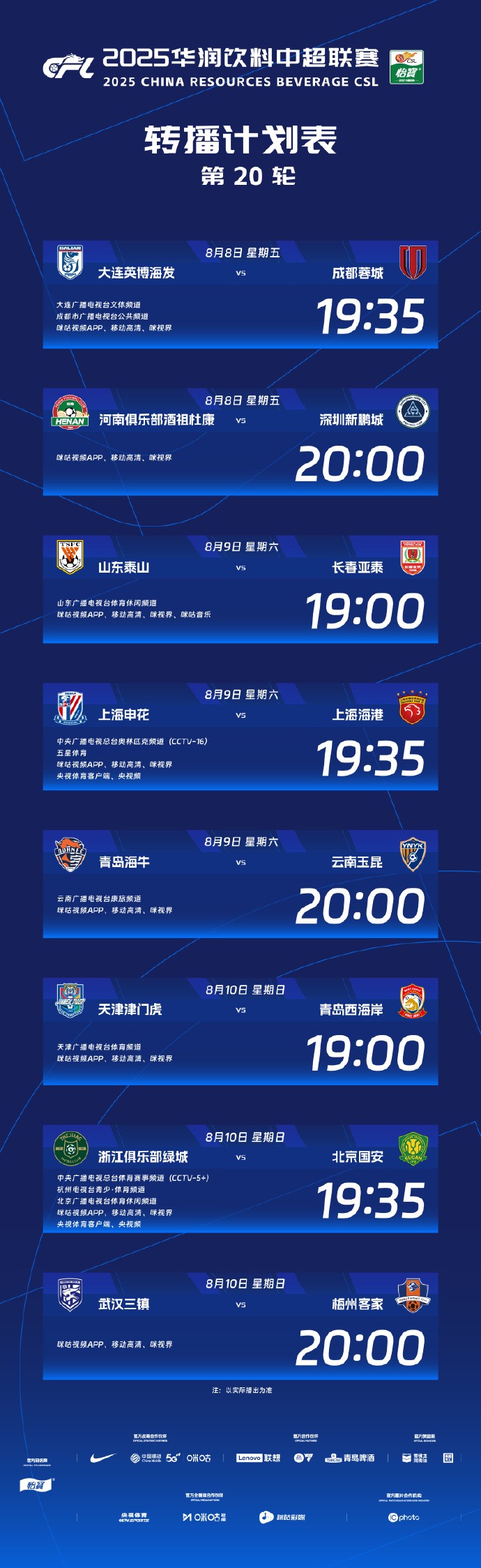 中超联赛官方发布了8月8日-8月10日中超第20轮比赛转播计划表:8月9日央视CCTV-16将转播上海申花vs上海海港的德比大战,8月10日央视CCTV-5+将转播浙江队vs北京国安。