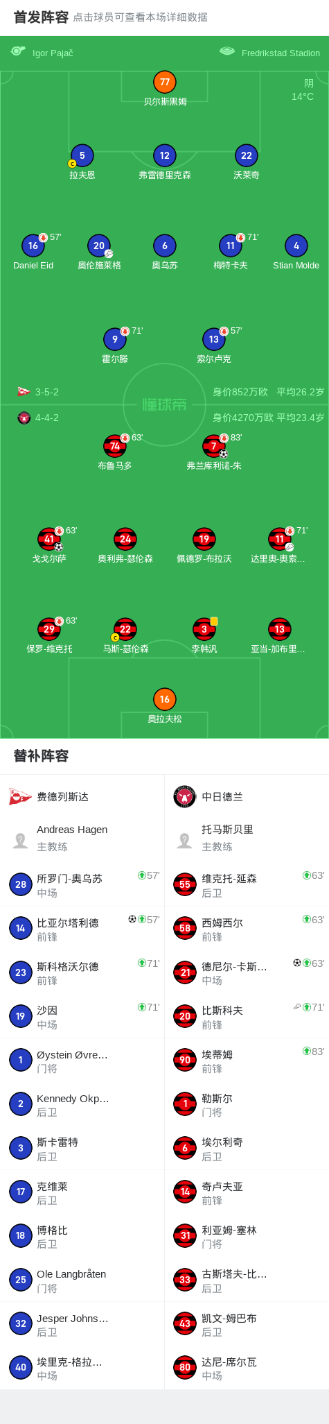 第77分钟,费德列斯达球员奥伦施莱格助攻比亚尔塔利德打入一球。