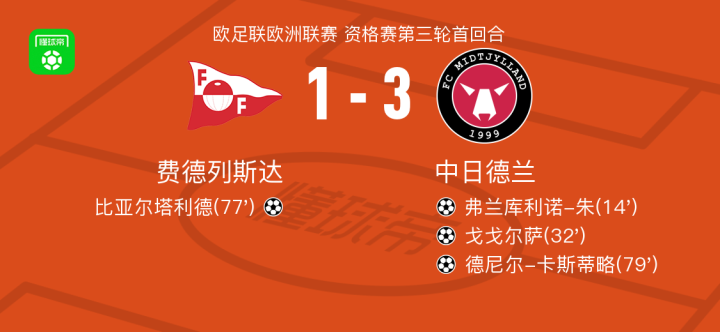北京时间8月8日,欧足联欧洲联赛资格赛第三轮首回合,费德列斯达迎战中日德兰。比赛第14分钟,中日德兰球员弗兰库利诺-朱成功破门,为球队首开纪录。第32分钟,达里奥-奥索里奥送出助攻,戈戈尔萨攻入一球,帮助中日德兰扩大领先优势。第77分钟,费德列斯达球员奥伦施莱格送出精妙传球,比亚尔塔利德抓住机会扳回一城。第79分钟,比斯科夫助攻德尼尔-卡斯蒂略破门,进一步巩固中日德兰的比分优势。最终,全场比赛结束,费德列斯达以1-3不敌中日德兰。