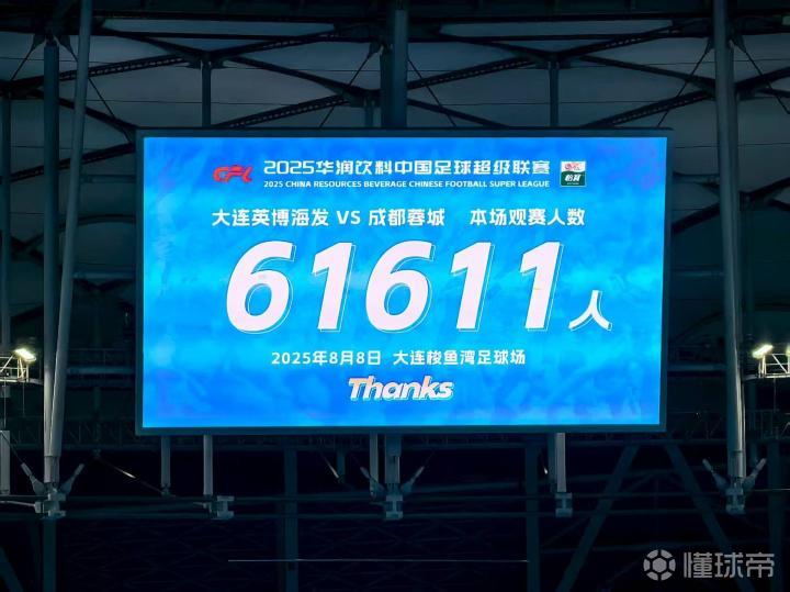 北京时间8月8日,中超第20轮大连英博主场迎战成都蓉城,大连梭鱼湾足球场上座人数达到61611人,再次刷新了本赛季大连英博的主场上座人数。