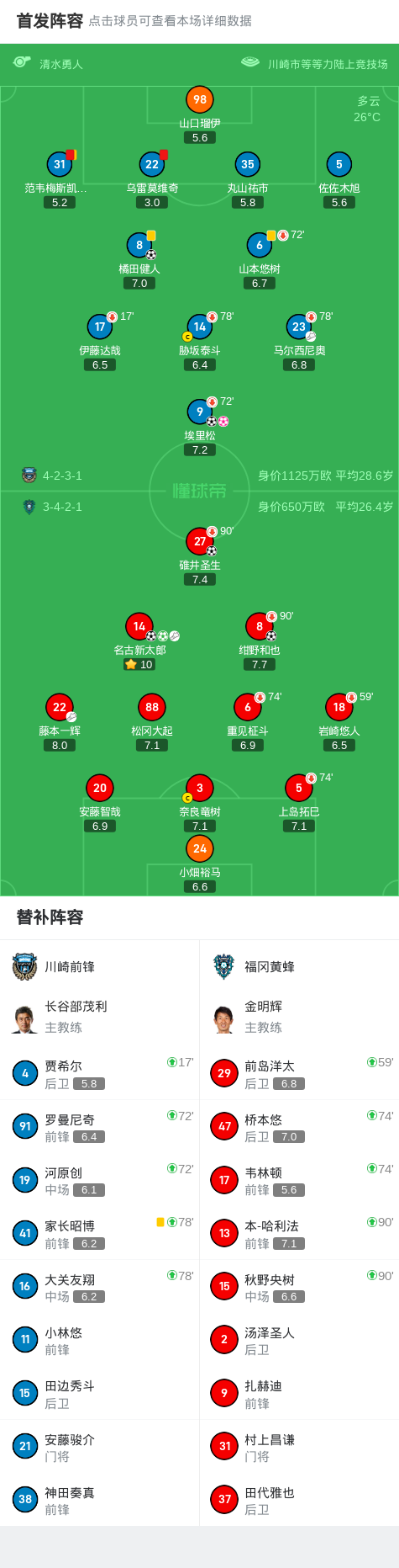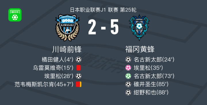 北京时间8月9日日本职业联赛J1 联赛 第25轮,川崎前锋主场对阵福冈黄蜂。川崎前锋橘田健人破门,埃里松破门,埃里松自摆乌龙。福冈黄蜂名古新太郎梅开二度,碓井圣生破门,绀野和也破门。最终比分川崎前锋 2-5 福冈黄蜂。