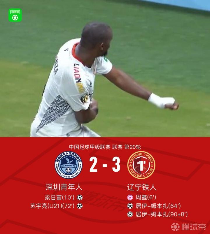 辽宁铁人客场3-2深圳青年人,姆本扎双响+补时绝杀,苏宇亮破门