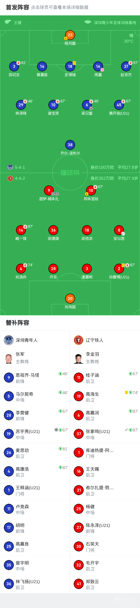 北京时间8月9日中国足球甲级联赛第20轮,深圳青年人主场对阵辽宁铁人。上半场,周鑫门前解围踢进自家球门,梁日富抓住对方解围失误抢射破门扳平;下半场,安以恩助攻姆本扎轻松吃饼,苏宇亮精彩过人推射入网,安以恩任意球攻门中柱差点绝杀,姆本扎补时破门上演梅开二度完成绝杀。最终比分深圳青年人 2-3 辽宁铁人。