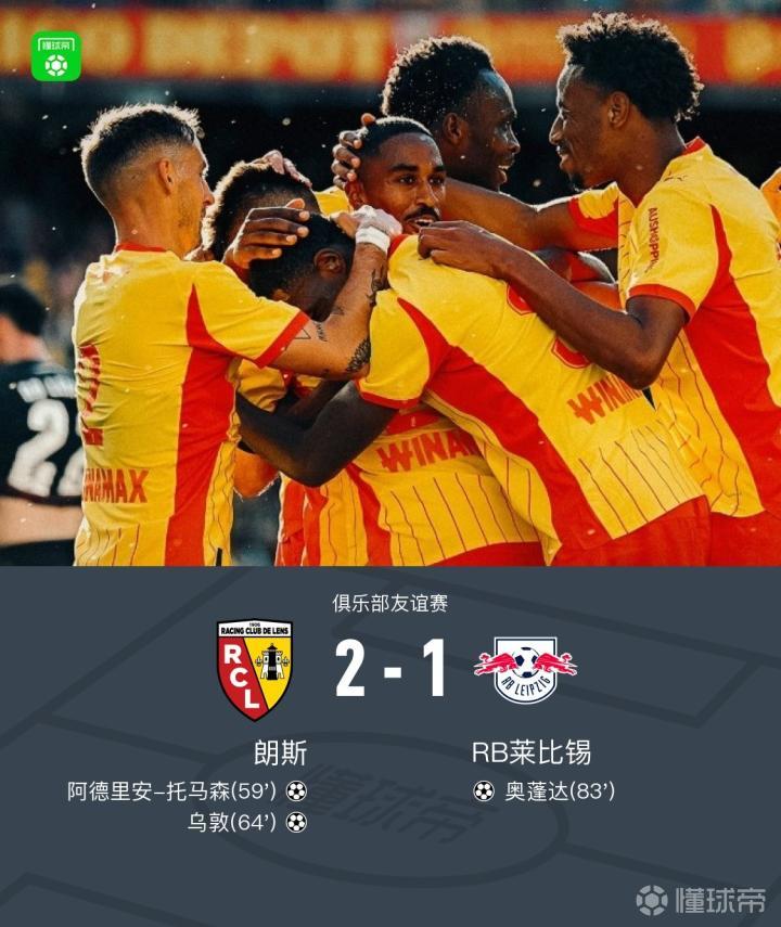 北京时间8月10日,一场俱乐部友谊赛在朗斯与RB莱比锡之间展开。比赛中,朗斯球员阿德里安-托马森与乌敦分别取得进球,RB莱比锡方面则由奥蓬达扳回一城。最终,朗斯以2比1战胜对手。