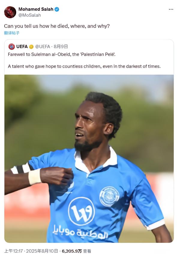 欧足联周五在社媒发文称:“告别‘巴勒斯坦贝利’苏莱曼-奥贝德,这位天才在最黑暗的时刻也曾为无数孩子带来希望。”