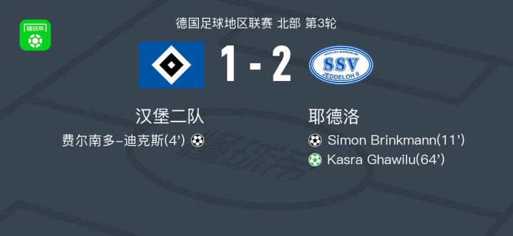 北京时间8月10日德国足球地区联赛北部赛区第3轮,汉堡二队坐镇主场迎战耶德洛。比赛开始后,汉堡二队由费尔南多-迪克斯率先破门。随后,耶德洛由Simon Brinkmann扳平比分。下半场,耶德洛球员Kasra Ghawilu主罚点球命中,帮助球队反超比分。最终,汉堡二队以1比2不敌耶德洛。