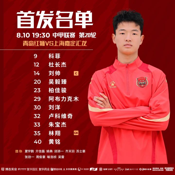 首发:9-科菲,12-杜长杰,14-刘帅,20-吴毅臻,23-柏佳骏,29-阿布力克木,30-刘洋,32-卢科维奇,33-朱宝杰,35-林翔(GK),40-黄铭(U21)