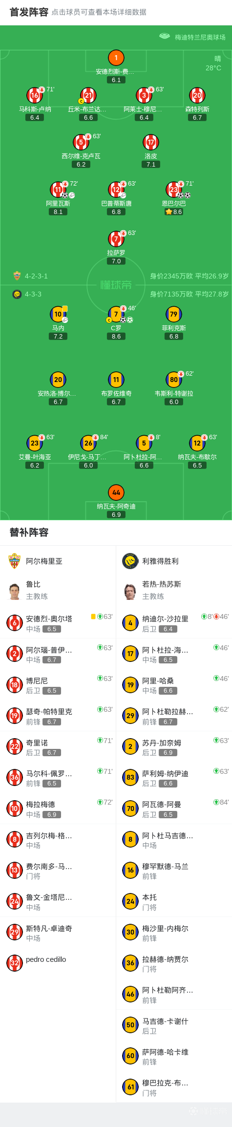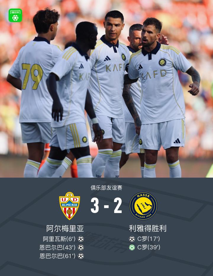 利雅得胜利2-3阿尔梅里亚,恩巴尔巴2球,C罗双响+造点难救主