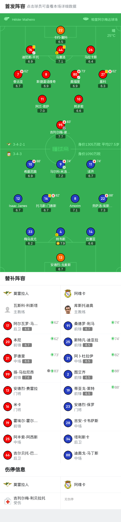 莫雷拉人2-1阿维卡,扬-马拉尼昂、吉列尔梅-谢蒂内破门