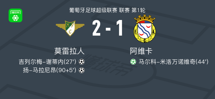 北京时间8月11日,葡萄牙足球超级联赛第1轮,莫雷拉人在主场迎战阿维卡。比赛中,莫雷拉人球员奥福里送出助攻,吉列尔梅-谢蒂内成功破门得分。随后,阿维卡球员马尔科-米洛万诺维奇通过点球机会扳平比分。比赛进入下半场补时阶段,迪尼斯-平托为莫雷拉人送出关键助攻,扬-马拉尼昂破门完成绝杀。最终,莫雷拉人以2比1战胜阿维卡,取得新赛季开门红。