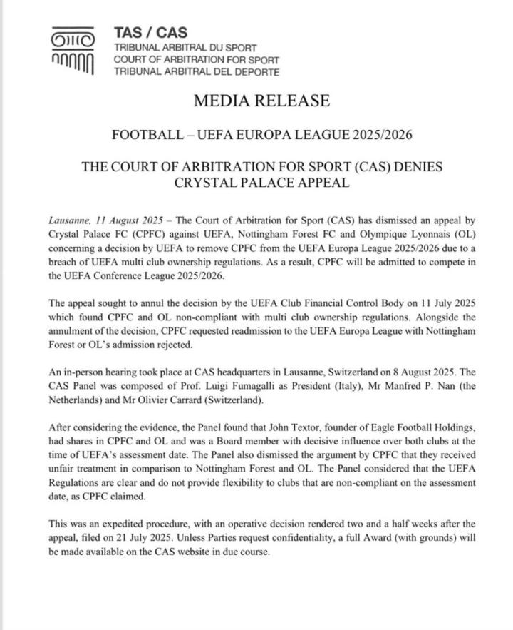 2025年8月11日 - 体育仲裁法庭(CAS)驳回了水晶宫足球俱乐部(CPFC)针对欧足联、诺丁汉森林足球俱乐部和奥林匹克里昂俱乐部(OL)的上诉。该上诉涉及欧足联因水晶宫违反多俱乐部所有权规定而取消其2025/2026赛季欧联杯参赛资格的决定。最终,水晶宫将获准参加2025/2026赛季欧洲协会联赛。