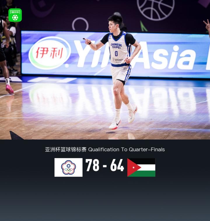 北京时间8月11日亚洲杯篮球锦标赛 1/4决赛资格赛,中国台北男篮对阵约旦男篮。半场中国台北男篮39-35约旦男篮,最终中国台北男篮78-64约旦男篮,下一轮的对手将是伊朗。