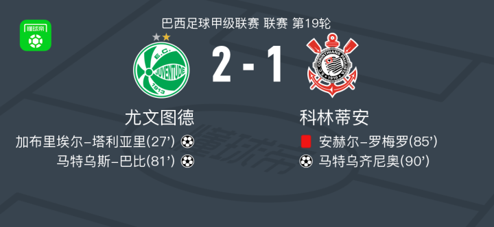 北京时间8月12日,巴西足球甲级联赛第19轮,尤文图德坐镇主场迎战科林蒂安。比赛中,尤文图德球员加布里埃尔-塔利亚里接队友马塞洛-埃梅斯助攻首开纪录;随后,队友内内送出助攻,帮助马特乌斯-巴比扩大比分。比赛尾声阶段,科林蒂安球员安赫尔-罗梅罗因犯规动作累计两张黄牌被红牌罚下,少一人作战的科林蒂安由马特乌齐尼奥扳回一城。最终,尤文图德以2比1战胜科林蒂安。
