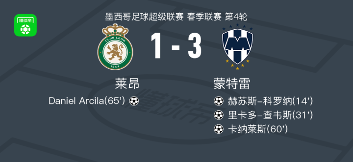 北京时间8月12日,墨西哥足球超级联赛春季联赛第4轮,莱昂坐镇主场迎战蒙特雷。比赛第14分钟,蒙特雷球员赫苏斯-科罗纳率先破门,帮助球队取得领先。第31分钟,贝尔泰拉梅送出助攻,里卡多-查韦斯推射建功,扩大比分优势。第60分钟,卡纳莱斯再下一城,进一步巩固领先位置。第65分钟,伊斯梅尔-迪亚斯送出助攻,莱昂球员Daniel Arcila扳回一球。最终,莱昂以1比3不敌蒙特雷。
