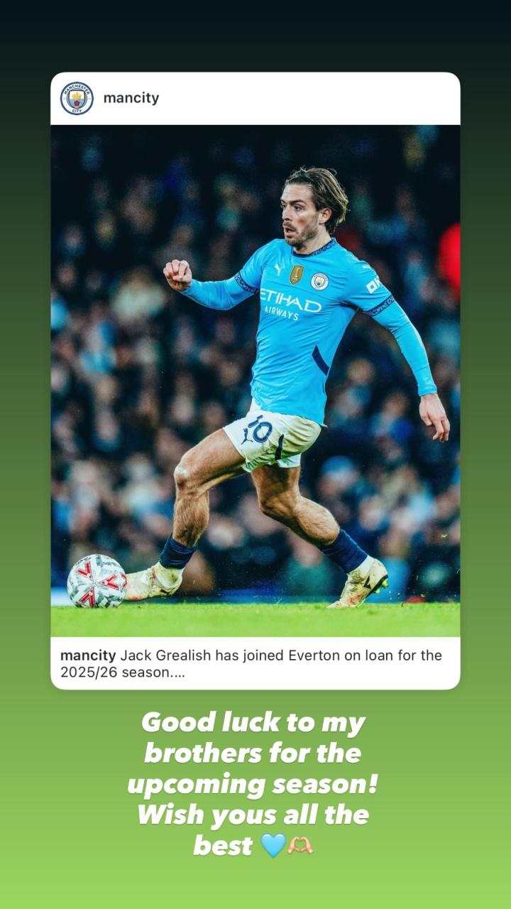 在租借加盟埃弗顿的消息官宣后,格拉利什在社交媒体祝福曼城的队友们新赛季好运。