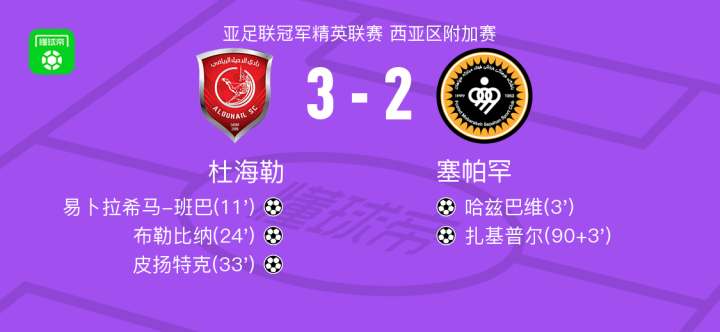 北京时间8月13日,亚足联冠军精英联赛西亚区附加赛展开角逐,杜海勒与塞帕罕展开激烈对决。比赛开始后,塞帕罕由哈兹巴维率先破门。随后,杜海勒展开强势反扑,易卜拉希马-班巴接布里若助攻扳平比分,不久后,图塔助攻布勒比纳反超比分,皮扬特克也成功破门扩大领先优势。比赛进入下半场补时阶段,塞帕罕由扎基普尔再追一球,但未能扭转局势。最终,全场比赛结束,杜海勒以3比2战胜塞帕罕。