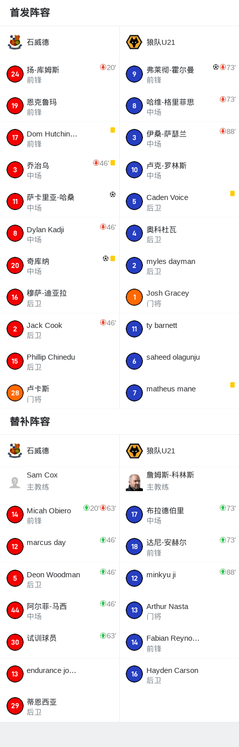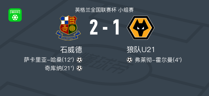 北京时间8月13日英格兰全国联赛杯 小组赛,石威德对阵狼队U21。石威德萨卡里亚-哈桑破门,奇库纳破门。狼队U21弗莱彻-霍尔曼破门。最终比分石威德 2-1 狼队U21。
