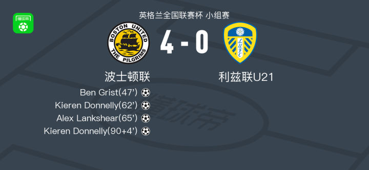 北京时间8月13日英格兰全国联赛杯 小组赛,波士顿联对阵利兹联U21。波士顿联Ben Grist破门,Kieren Donnelly梅开二度,Alex Lankshear破门。最终比分波士顿联 4-0 利兹联U21。