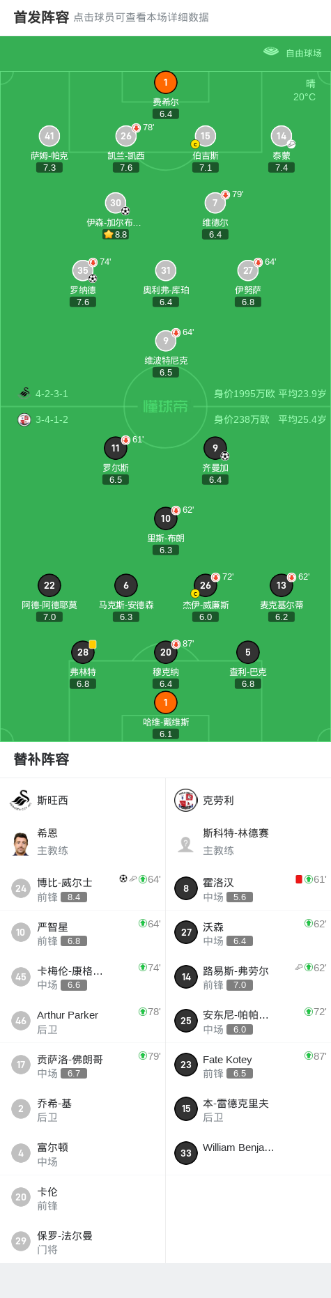 第67分钟,斯旺西球员博比-威尔士打入一球。