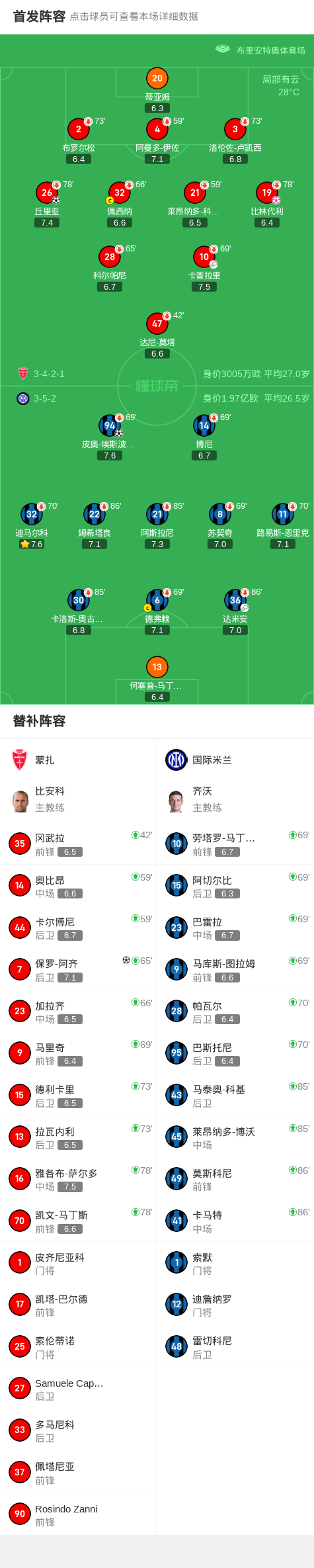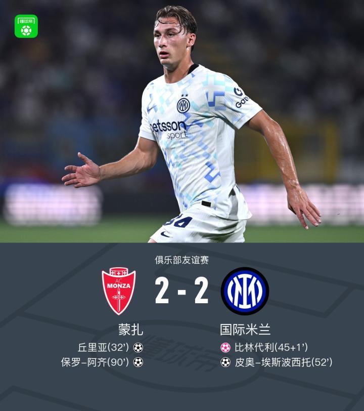 北京时间8月13日进行的一场俱乐部友谊赛中,蒙扎与国际米兰展开较量。上半场,卡普拉里助攻,丘里亚破门。迪马尔科传中,比林代利送乌龙大礼。下半场,埃斯波西托脚后跟破门。比赛尾声阶段,保罗-阿齐扳平比分。全场比赛结束,国米2-2蒙扎。