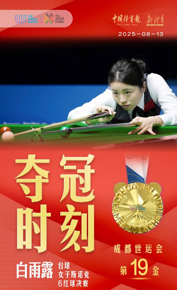 成都世运会女子斯诺克6红球:白雨露2-0战胜那鲁差,夺得冠军gaoniu @懂球帝2025-08-13 12:24北京时间8月13日,成都世运会女子斯诺克6红球决赛,白雨露2-0战胜泰国选手那鲁差,获得世运会该项目冠军。这也是中国体育代表团本届赛事第十九枚金牌。白雨露总结说:“如果是15颗红球,我觉得自己会有更多优势。但6颗红球的比赛对每位选手来说都要更加严谨,因为球少了,偶然性更大。这次能够代表国家出战是很可贵的机会,和个人的比赛是不一样的,很开心能够夺得冠军,为国家也为自己赢得了荣誉。”展开更多
