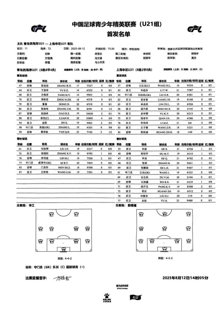 上海申花足球俱乐部8月12日15:30 ,2025中国足球青少年精英联赛(U21组)第11轮上海申花对阵青岛西海岸的比赛在呼和浩特国家北方足球训练基地进行。比赛第45分钟,王汉龙送直塞,温竹新突入禁区左脚低射破门。第90分钟,和新后场发动长传,石炳鑫晃过出击门将后破门,帮助申花锁定2-0的胜局。8月15日19:30,申花将继续对阵第12轮对手大连英博。