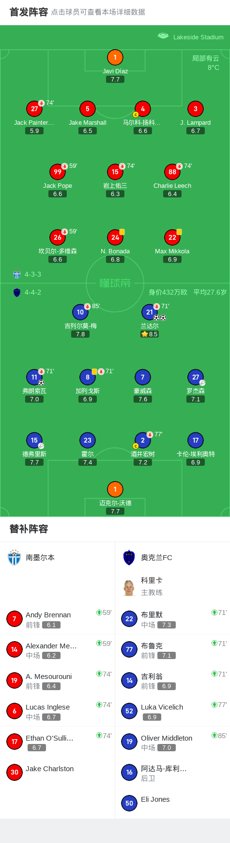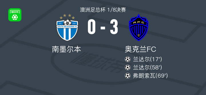 北京时间8月13日澳洲足总杯 1/8决赛,南墨尔本对阵奥克兰FC。奥克兰FC兰达尔梅开二度,弗朗索瓦破门。最终比分南墨尔本 0-3 奥克兰FC。