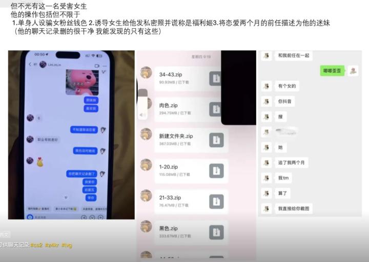 单身人设对女粉骗财骗色,劈腿骗X脚踩n条船,跟每一位前任藕断丝连,携带多种X病,诱导女生发各类私密照并保存威胁女生与其联系,Pua女粉让其当地下恋人致其抑郁自X。
