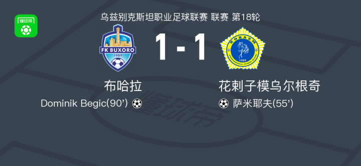 北京时间8月13日乌兹别克斯坦职业足球联赛第18轮,布哈拉主场迎战花剌子模乌尔根奇。比赛中,花剌子模乌尔根奇球员萨米耶夫在上半场率先破门,为主队取得领先。下半场临近尾声时,布哈拉球员图普利耶夫送出关键助攻,帮助队友Dominik Begic扳平比分。最终双方以1比1握手言和。
